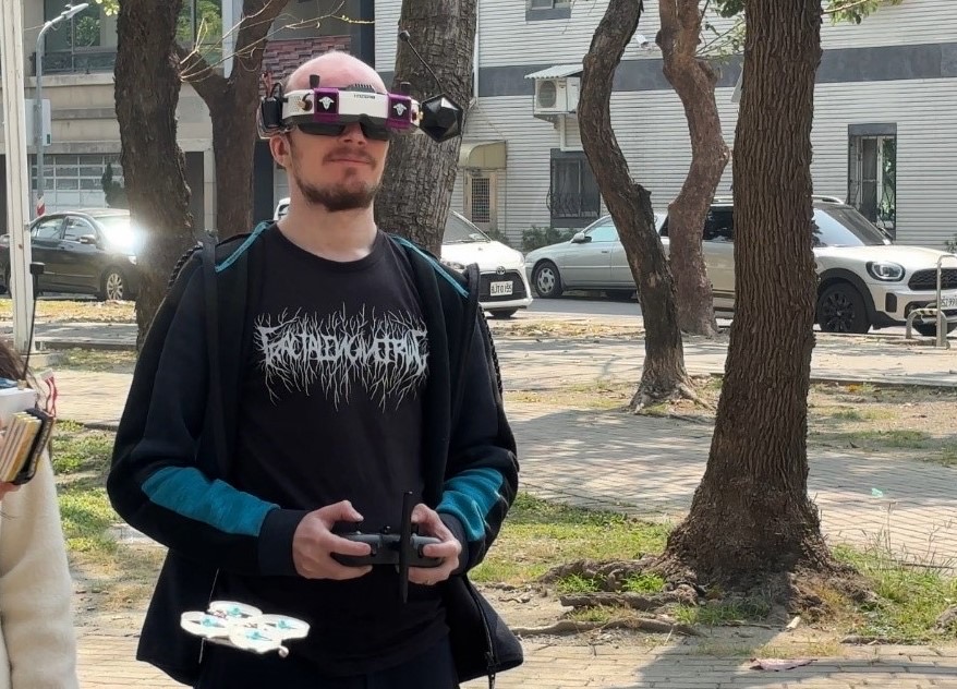 ↑圖說:熱愛競速無人機的Yves,憑藉工程師背景,一手包辦「弗萊克朵」無人機產品研發。圖為Yves示範無人機操作飛行畫面。(圖片來源:高雄市青年局提供)
