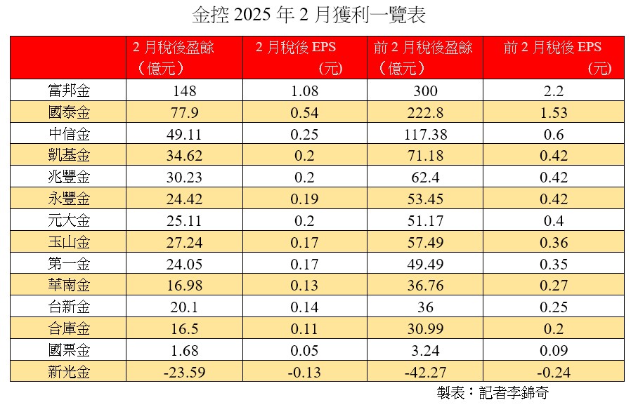 金控2月獲利全部出爐,其中,富邦金稅後淨利148億元,單月稅後每股盈餘(EPS)1.08元;累計前2月稅後盈餘衝上300億元,較去年同期成長34%,稅後EPS為2.2元,蟬聯金控獲利王。