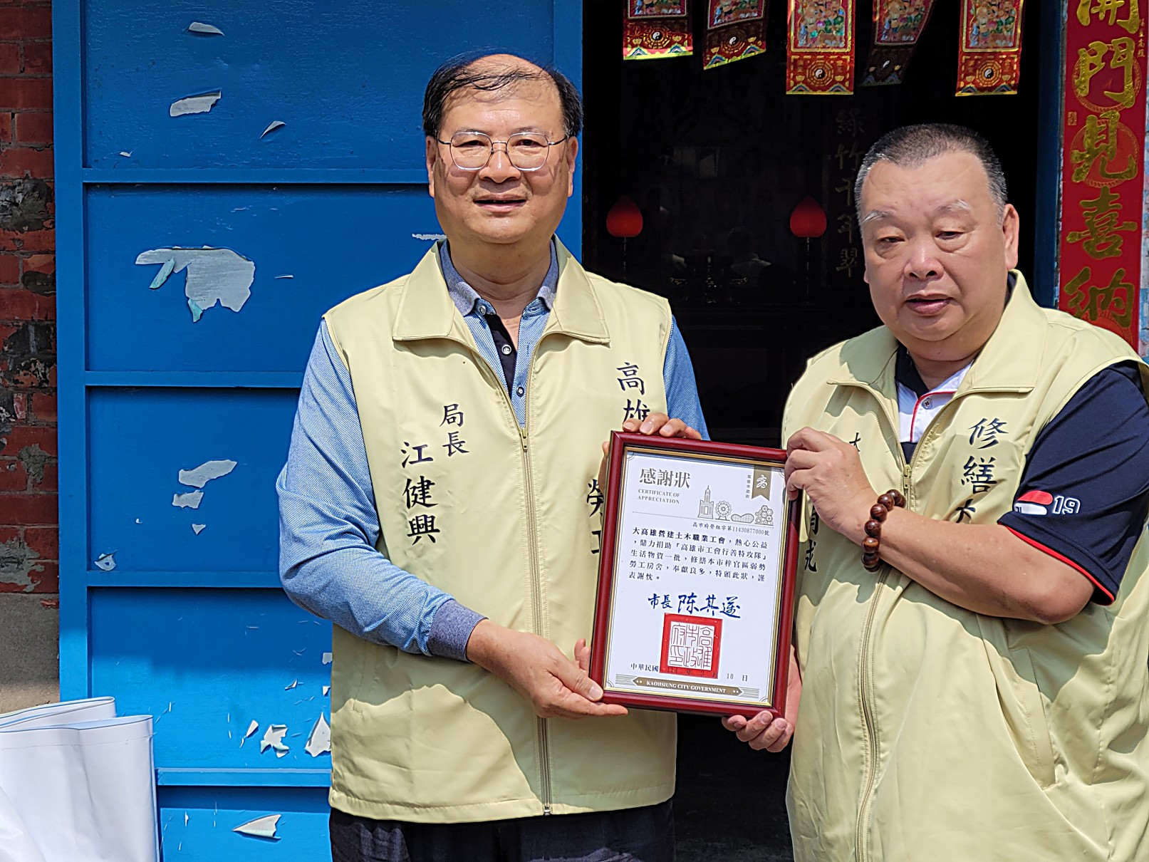 ↑圖說:江健興代表陳其邁市長頒贈感謝狀與此次修繕救助行動的各界代表。(圖片來源:高雄市勞工局提供)