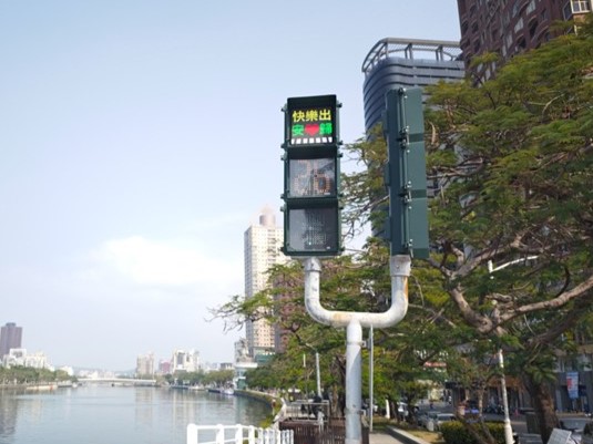 ↑圖說:在行人紅燈等候時間,透過屏幕上生動活潑的標語與動畫提醒遵守交通規則,提高行人對交通安全的認知(圖片來源:高雄市交通局提供)