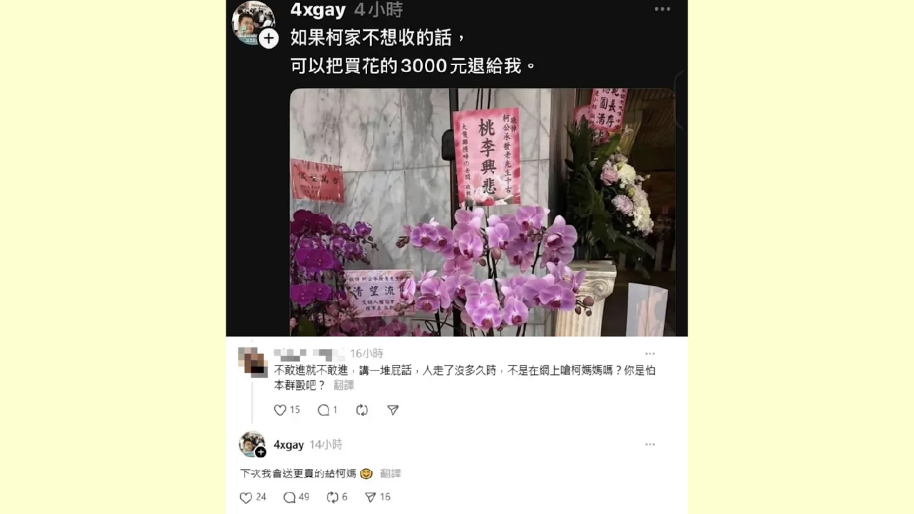 四叉貓花圈遭拒冷血開嗆「下次送更貴的給柯媽」網友怒批:毫無底線!