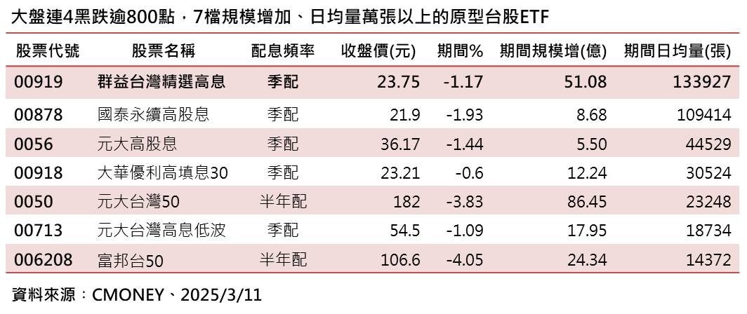 回顧台股先前連4黑,一共跌了800點,跌幅3.54%。不過,台股ETF卻有越跌越買、大跌大買的態勢,統計58檔原型台股ETF,規模逆勢增加,且日均量萬張以上的台股ETF,共有7檔,其中,即將在3月18日除息的(00919)群益台灣精選高息,預估年化配息率12.11%,帶動日成交均量13.3萬張,交投熱絡居冠,其次是(00878)國泰永續高股息的10.9萬張居次。