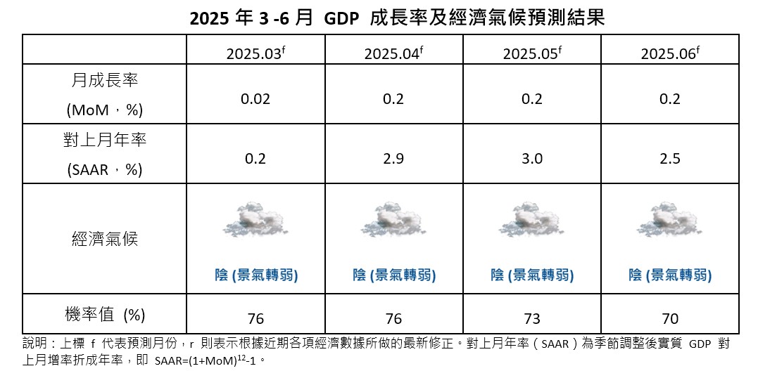 同前揭AI趨勢帶動產業發展,搭配短期搶出口效應支撐,使今年上半年的台灣經濟成長動能穩定。當進入下半年,全球貿易戰對投資與消費之負面影響可能逐步顯現,景氣面臨放緩風險。團隊研判:第二季台灣經濟氣候將維持象徵景氣轉弱之「陰」,機率將在70%以上。
