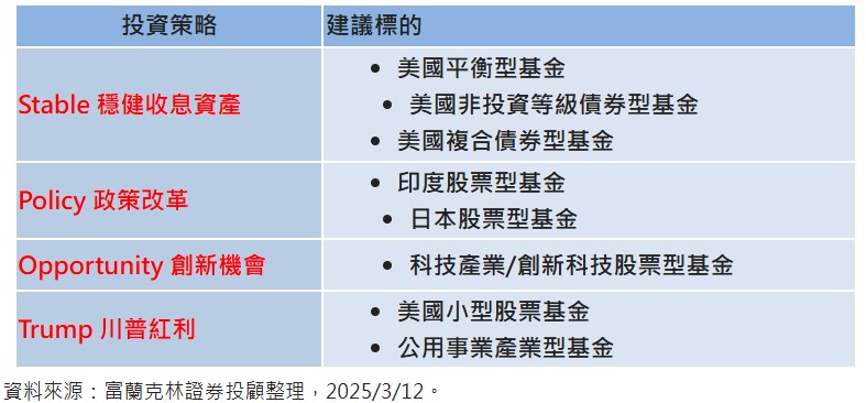 富蘭克林投顧建議,以「Stable穩健收息資產」為核心,包括美國平衡型基金、美國非投資等級債和美國複合債券型基金,度過波動期;另外,預期股市短線震盪,無礙中長期多頭格局,建議多路並進,看好具備「Policy政策改革」的印度和日本股票型基金、「Opportunity 創新機會」的科技及創新科技股票型基金、以及可受惠「Trump川普紅利」減稅及美國製造回流的美國小型股和公用事業產業,採取大額定期定額累積部位,靜待烏雲散去後的回升行情。