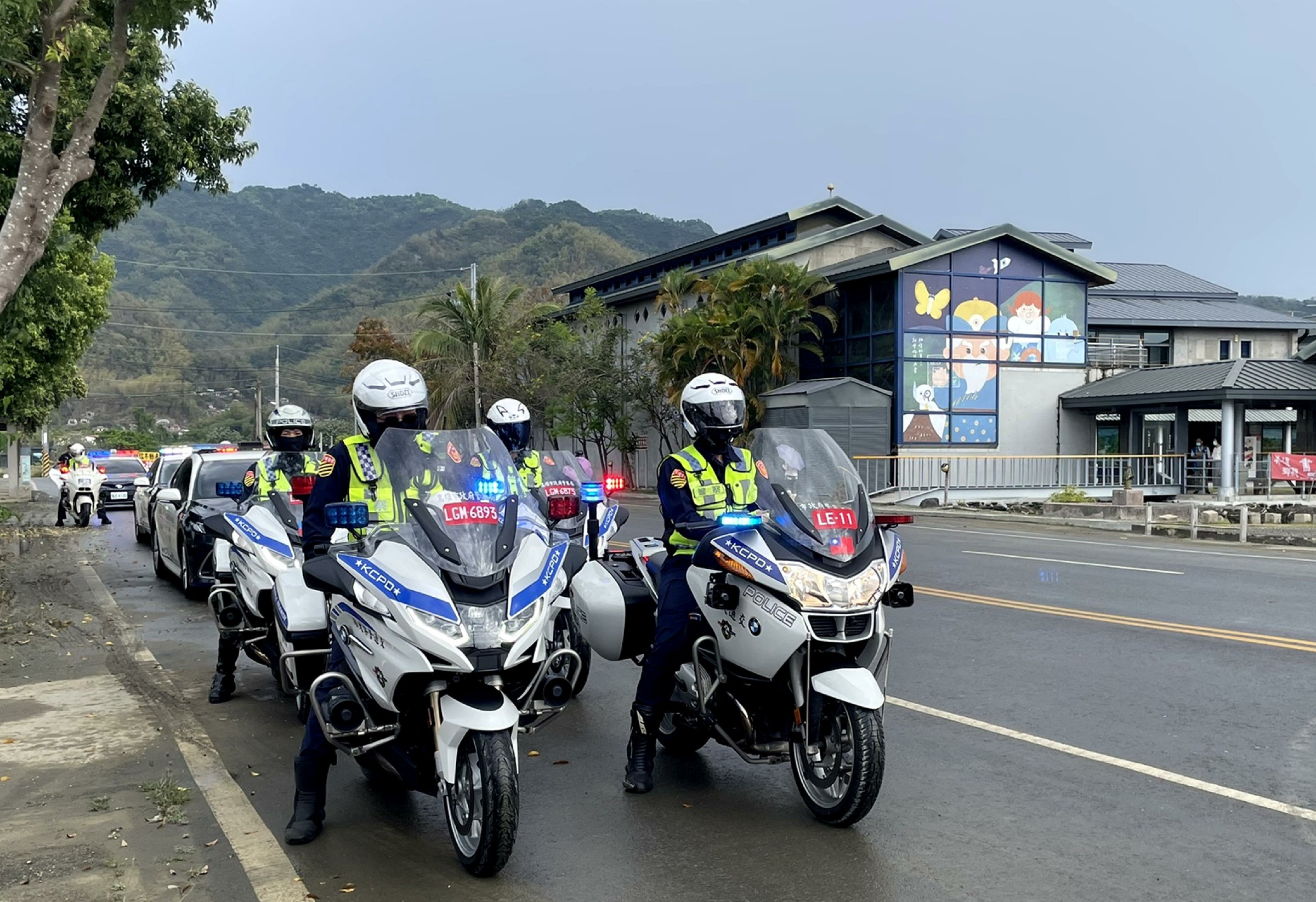 ↑圖說:高雄市政府警察局及所屬分局、交通警察大隊演練行經美濃區客家文化館前情形。(圖片來源:高雄市運發局提供)
