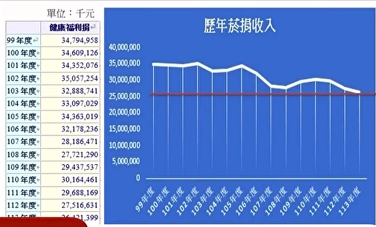 圖說:菸捐比例增加收入卻逐年下滑 畫面來源:立法委員陳瑩辦公室
