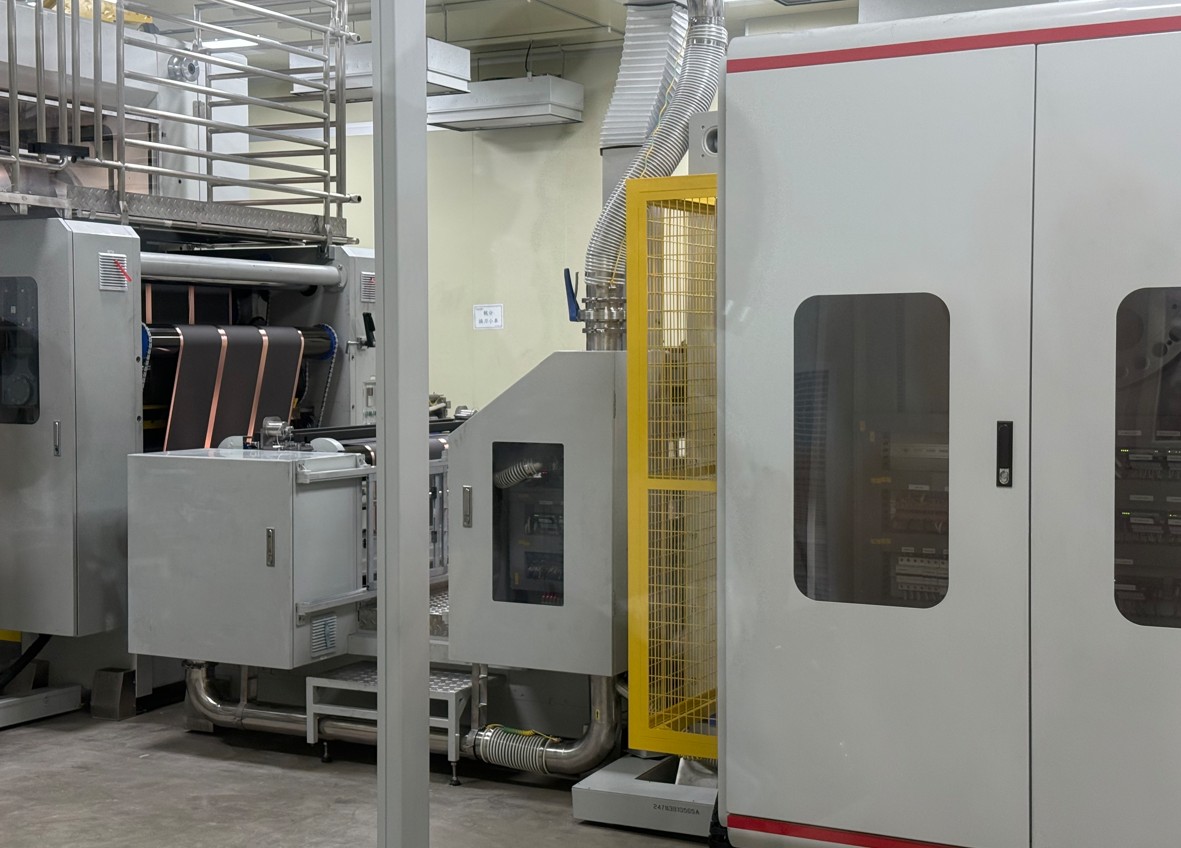 ▼電芯製程之一的「塗佈」。(如下圖,記者李錦奇攝影),是將正、負極漿料,塗覆於金屬箔材表面,而獲得正、負極片。