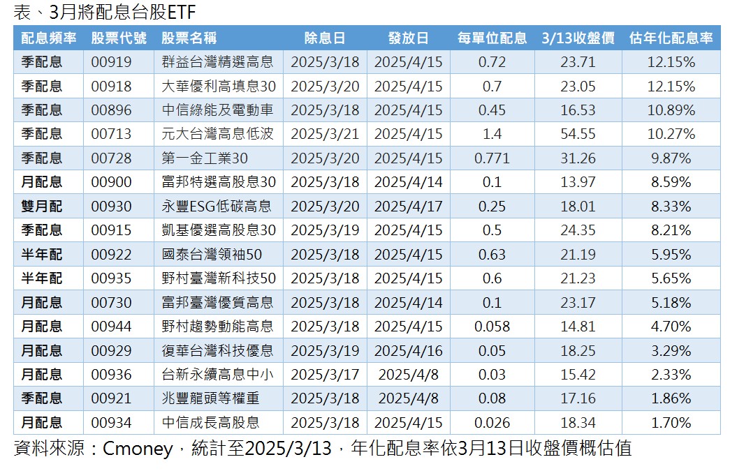 領息族請留意!台股ETF三月除息高峰,即將到來,截至目前為止,還有16檔準備登場,其中,年化配息率較高的5檔,至少9%起跳,其中,群益台灣精選高息(00919)、大華優利高填息30(00918)都達12.15%。