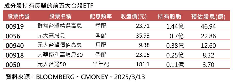 統計持有長榮股數較高的前5檔台股ETF,依序為(00919)群益台灣精選高息的1.44億股、(0056)元大高股息持有0.7億股、(00940)元大台灣價值高息持有0.38億股、(00918)大華優利高填息30持有0.25億股、(0050)元大台灣50持有0.11億股。