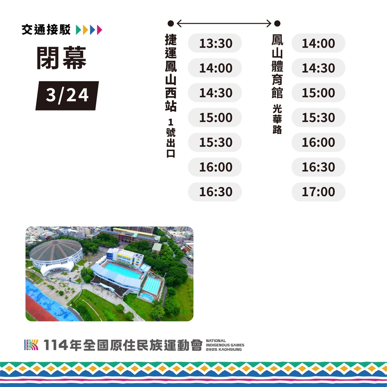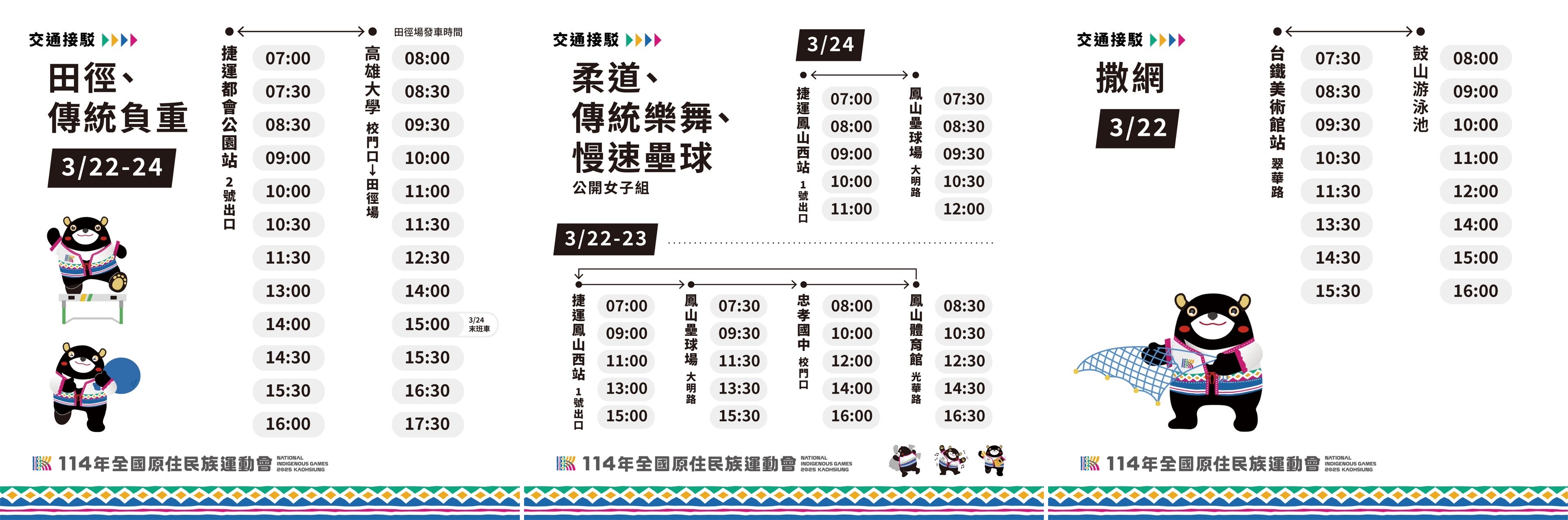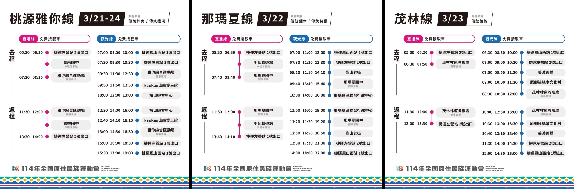 運動發展局提醒,接駁站點與時刻表已公布於全原運官網,歡迎民眾多加利用。由於賽事期間部分競賽場地停車空間有限,建議民眾搭乘免費接駁車,並事先於官方網站預約,詳情請至大會官網(官網主頁>服務資訊>免費接駁車)查詢:https://114kaohsiung.khsport.tw/Module/Pages/Index.php?ID=367。
