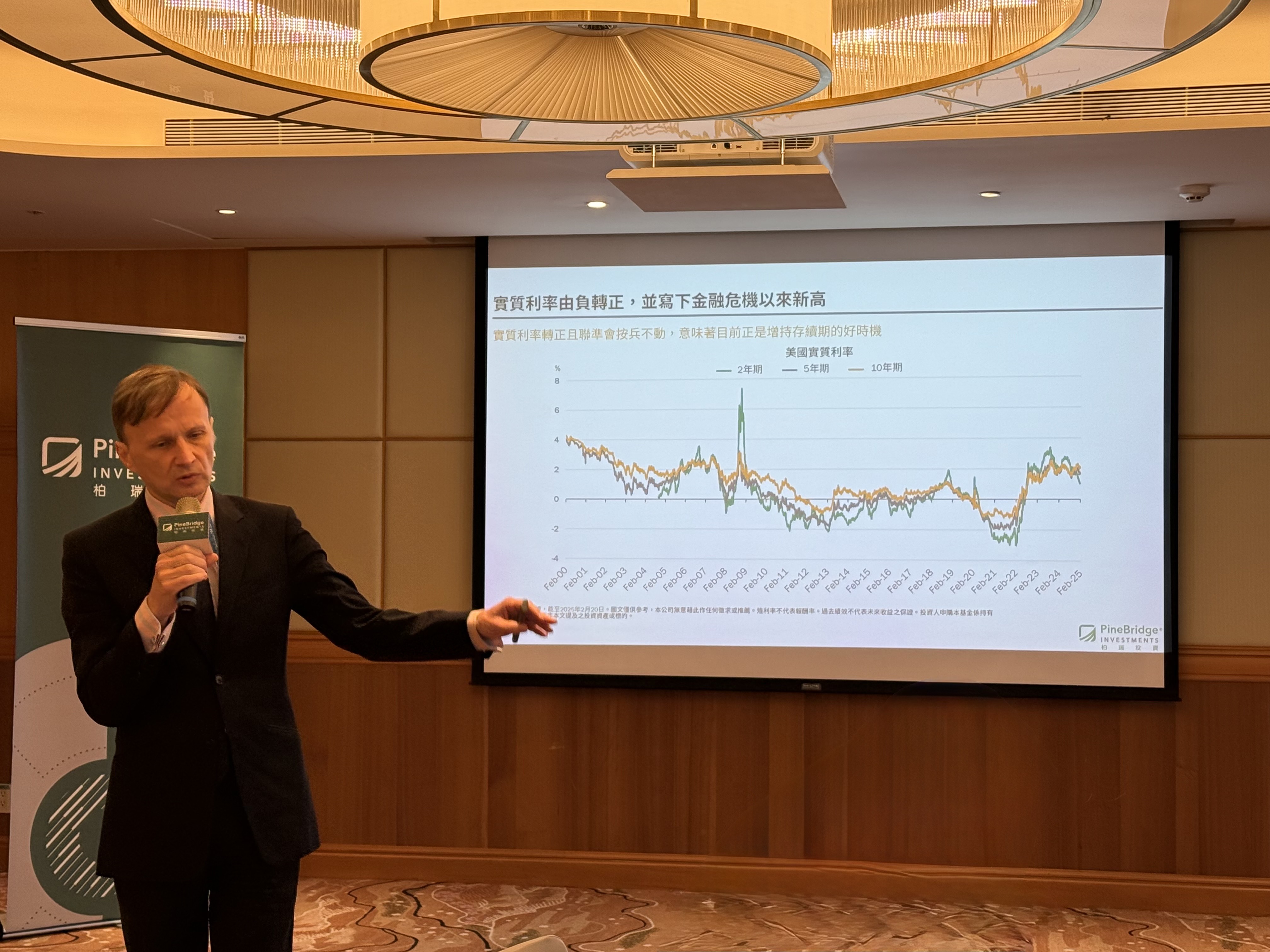 柏瑞投信也再度邀請母集團柏瑞投資2位經理人來台,分別帶來特別股、非投資等級債的最新投資觀點。其中,柏瑞投資特別股策略投資經理人卡洛夫(Vladimir Karlov)表示,現階段美國實質利率已由負轉正,並來到2007-2008年金融危機以來新高(如下圖,記者李錦奇攝影),搭配聯準會的按兵不動,意味著目前正是增持存續期的好時機,且機會稍縱即逝。