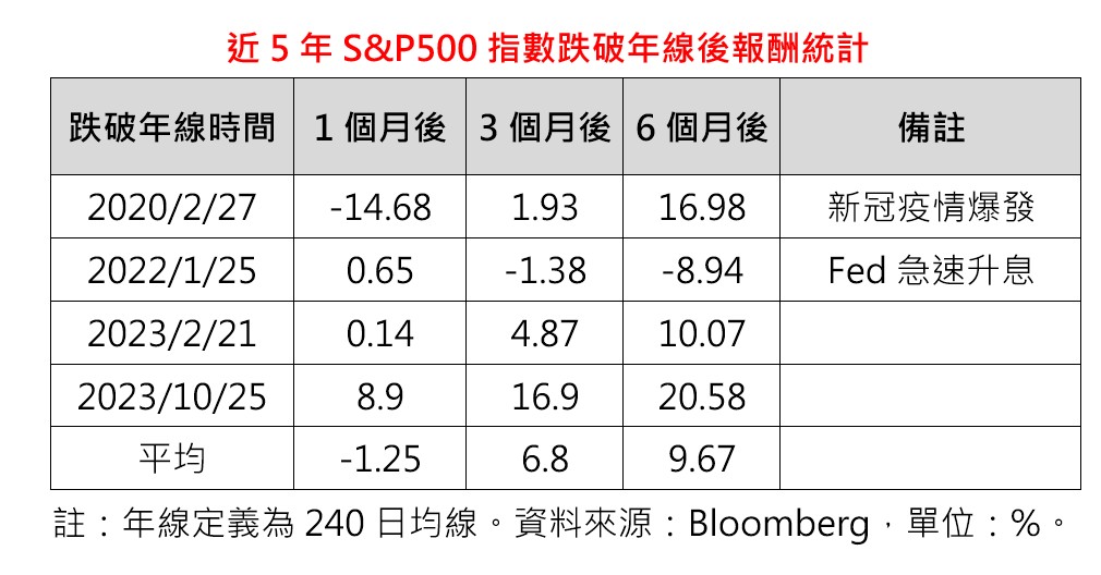 根據彭博資訊統計,過去5年S&P 500指數共有4次跌破年線,其中,2020年2月爆發新冠疫情,導致行情急跌,1個月後表現仍弱;2022年1月底當次,因美國聯準會為控制通膨後續開啟急速升息,後續行情仍陷入回檔整理走勢。