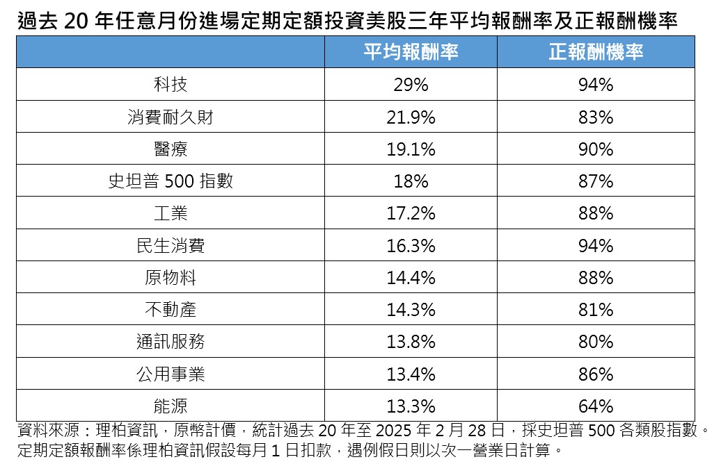 根據統計,過去20年來,任一月份進場定期定額投資史坦普500指數三年,平均報酬率為18%,若投資具創新題材的科技股,平均報酬率更達29%,上漲機率超過九成,另投資人也可藉由美國穩定月收益平衡型基金或複合債券型基金為核心,並搭配定期定額投資創新科技基金在近期市場動盪之際打造出一個攻守兼備的投資組合,並同步參與長期科技發展機會。