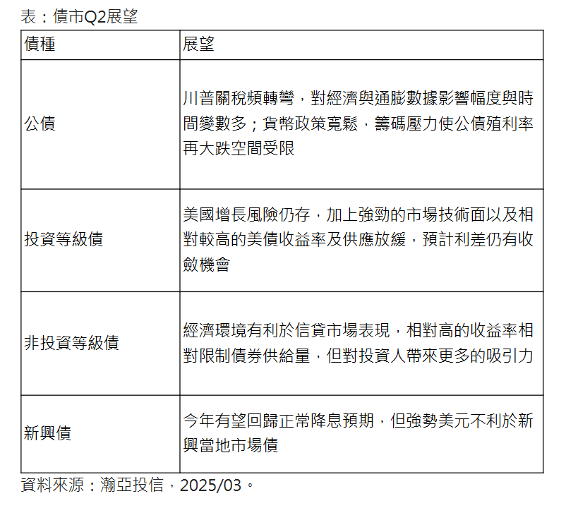瀚亞投信Q2債市投資展望出爐,強調關稅政策不確定性高,股市短線波動會持續,建議適度分散投資組合因應;環境充斥雜音,市場恐有經濟衰退擔憂,債券可望在此情境下扮演風險平衡的角色。