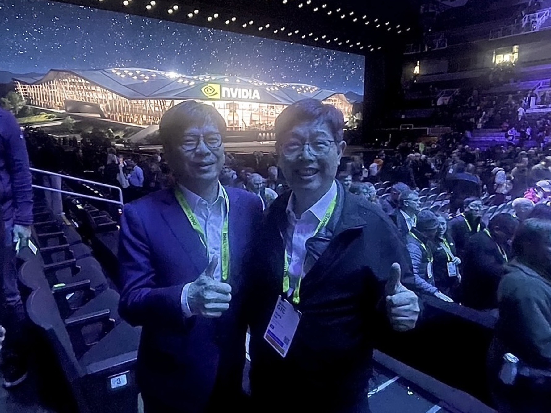 圖說:陳其邁(中)參加NVIDIA GTC大會,與華碩董事長施崇棠(左)同坐VIP區。(圖片來源:高雄市經發局提供)