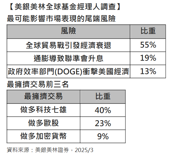 在尾端風險方面,全球貿易戰引發經濟衰退為最令人擔憂的三大尾端風險之首,通膨導致聯準會升息居次,擔心政府效率部門(DOGE)衝擊美國經濟則首次進入前三大尾端風險。