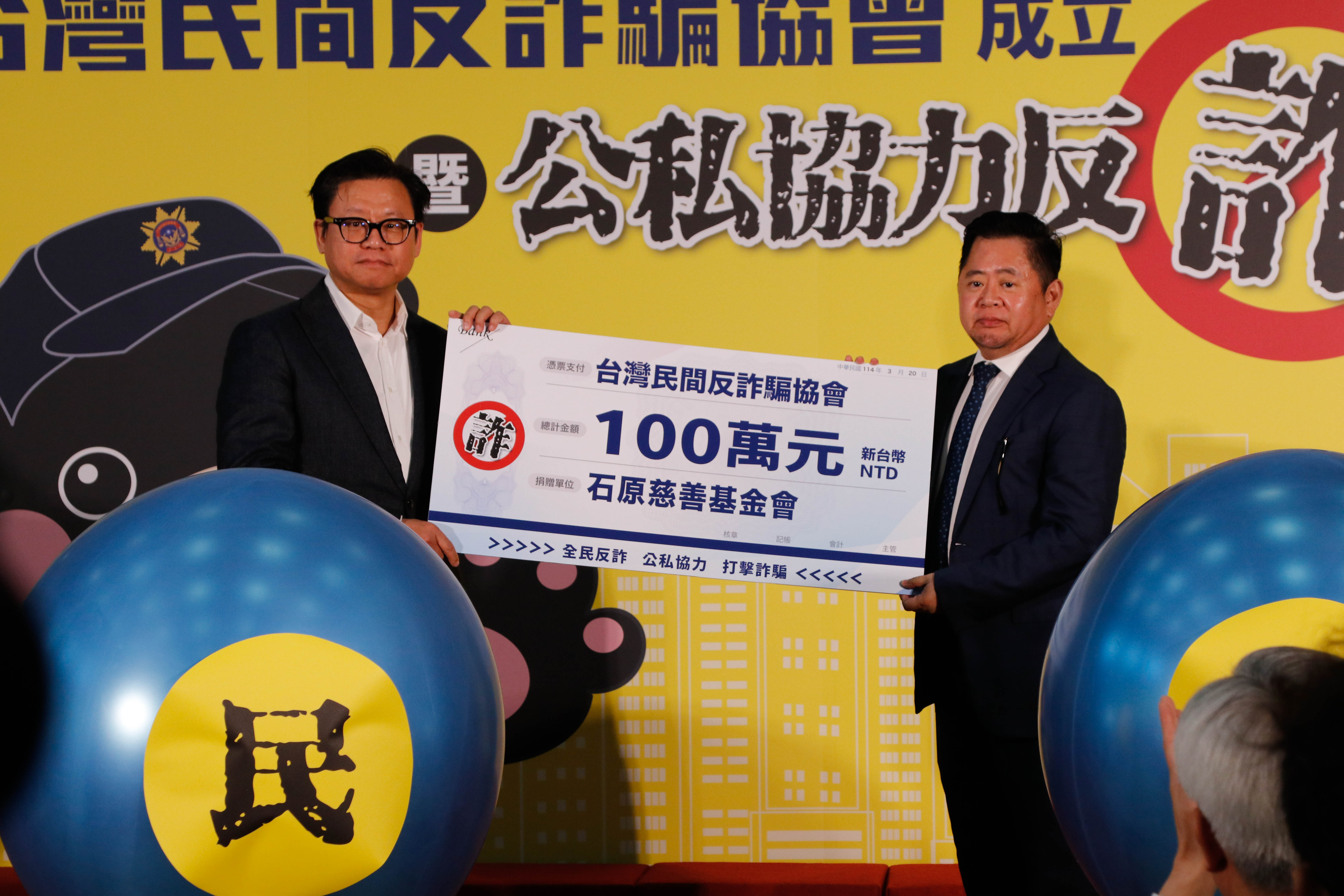 今天的成立大會,財經名人徐俊相、胡睿涵、施昇輝、盧燕俐、白嘉莉、葉國華、徐佳馨、李永年等人也出席記者會,一起力挺公私協力反詐。為支持反詐協會,石原慈善基金會捐款100萬,亞太集團楊振豐董事長捐款100萬元,知名的建設公司集團李董事長捐款100萬元。