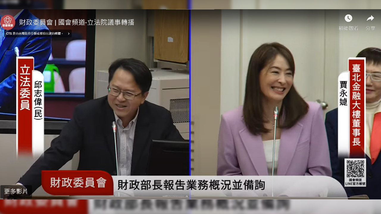 ↑圖說:立院財委會上演一場最有顏值的質詢,台灣菸酒公司董事長湯期安:推動加熱菸上市,盼提升公司盈餘,台北101董事長賈永婕:質詢過程緊張,頻頻修正數據。(圖片來源:翻攝自立法院國會頻道)