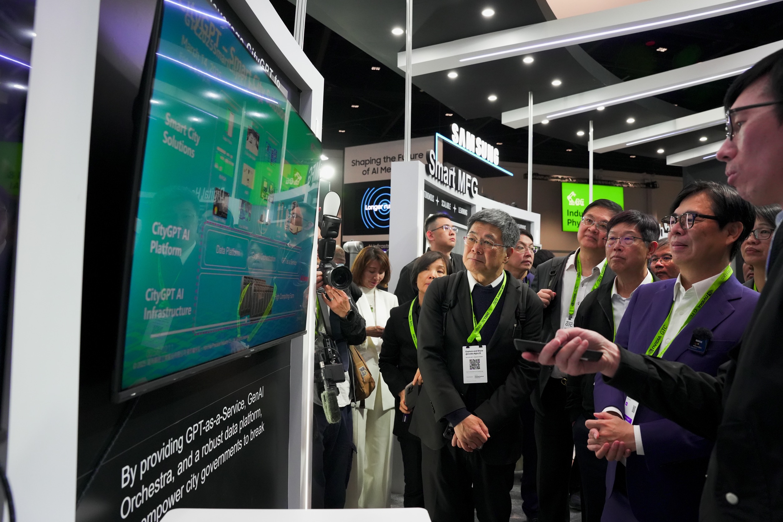 作為發展智慧城市的重要合作夥伴,鴻海近年積極投資高雄,採取「軟體為主,硬體為輔」的策略,將智慧城市、智慧製造與智慧EV平台三大技術研發布局高雄,高雄軟體研發中心已於前年底正式開幕,並同步規劃設立南區總部。此次GTC大會,鴻海董事長劉揚偉親自率團參加,展出包括NVIDIA Blackwell架構最新產品及AI護理機器人Nurabot等多項AI發展,更特別展出與高雄市智慧城市的合作成果,以生成式AI為核心替高雄打造的專屬「CityGPT」平台,連結於智慧治理、智慧交通等應用成績。