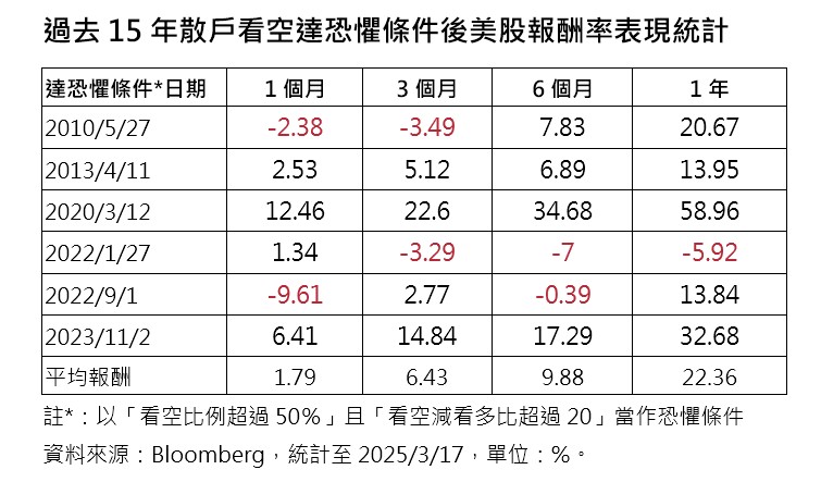 據統計,包含今年在內,過去15年散戶「看空比例超過50%」且看空減去看多數值超過20的情境,共有7次,其中前6次在散戶看空達恐懼條件後,美股S&P500指數不論是1個月、3個月、6個月,都是4次上漲、2次下跌,正報酬機率約66.6%,且平均算起來,正報酬分別為1.79%、6.43%、9.88%。