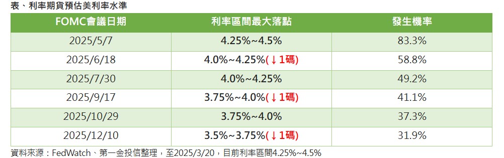美國聯準會維持聯邦基準利率區間於4.25%至4.5%間,聯準會利率點陣圖顯示,今年有2碼降息空間,不過,FedWatch利率期貨推估,今年底前還可能有3碼降息空間。最快6月降息1碼,接下來分別在9月、12月各降息1碼。