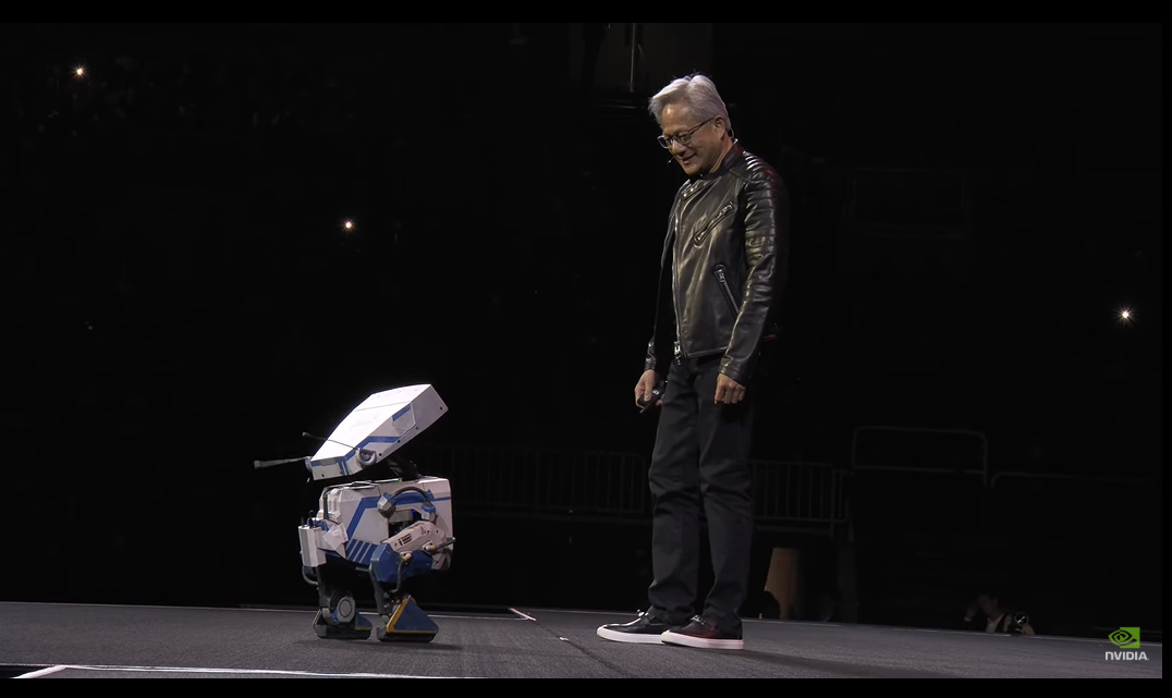 ▼圖說:黃仁勳在GTC大會與機器人blue互動,成為會場焦點之一。(圖/翻攝輝達GTC/Youbute)