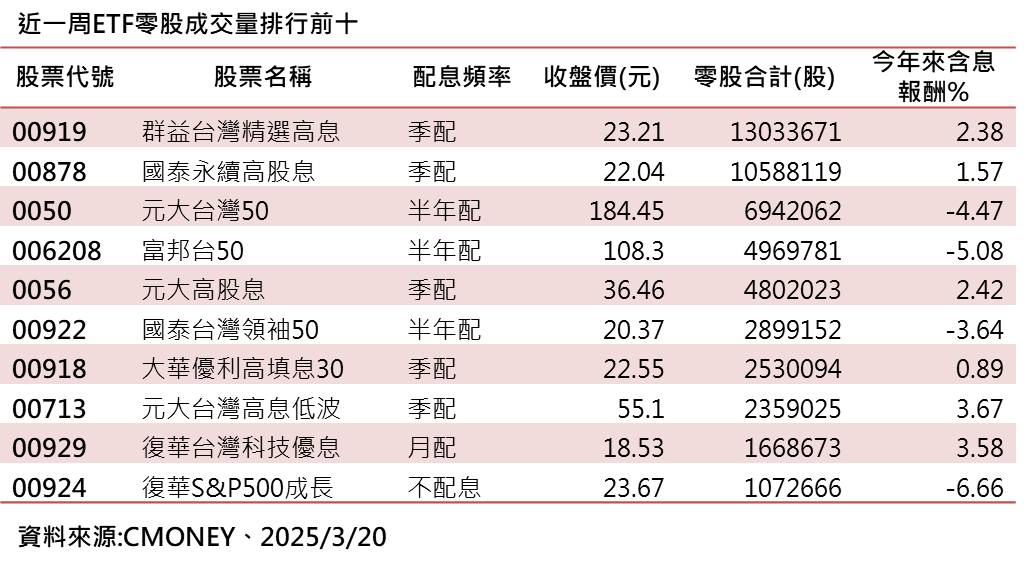 從零股交易來看,近一周成交量前十大都是台股ETF,其中,台股高息ETF佔6席,前2名也都是高息ETF,顯示台股高息ETF持續受小資存股族青睞。其中,(00919)群益台灣精選高息ETF最受青睞,其次是國泰永續高股息(00878)、元大台灣50(0050)。