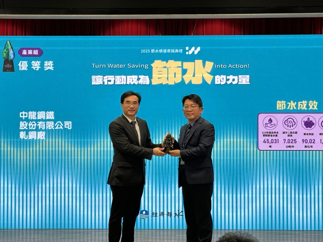 經濟部水利署於3月20日,在經濟部大禮堂舉辦「114年節水績優獎表揚典禮」,表揚在水資源管理與節水技術應用上表現優異的企業,中龍鋼鐵軋鋼廠憑藉卓越的水資源調度與高效的用水管理策略,榮獲「優等獎」肯定,由生產助理副總洪正雄代表領獎。