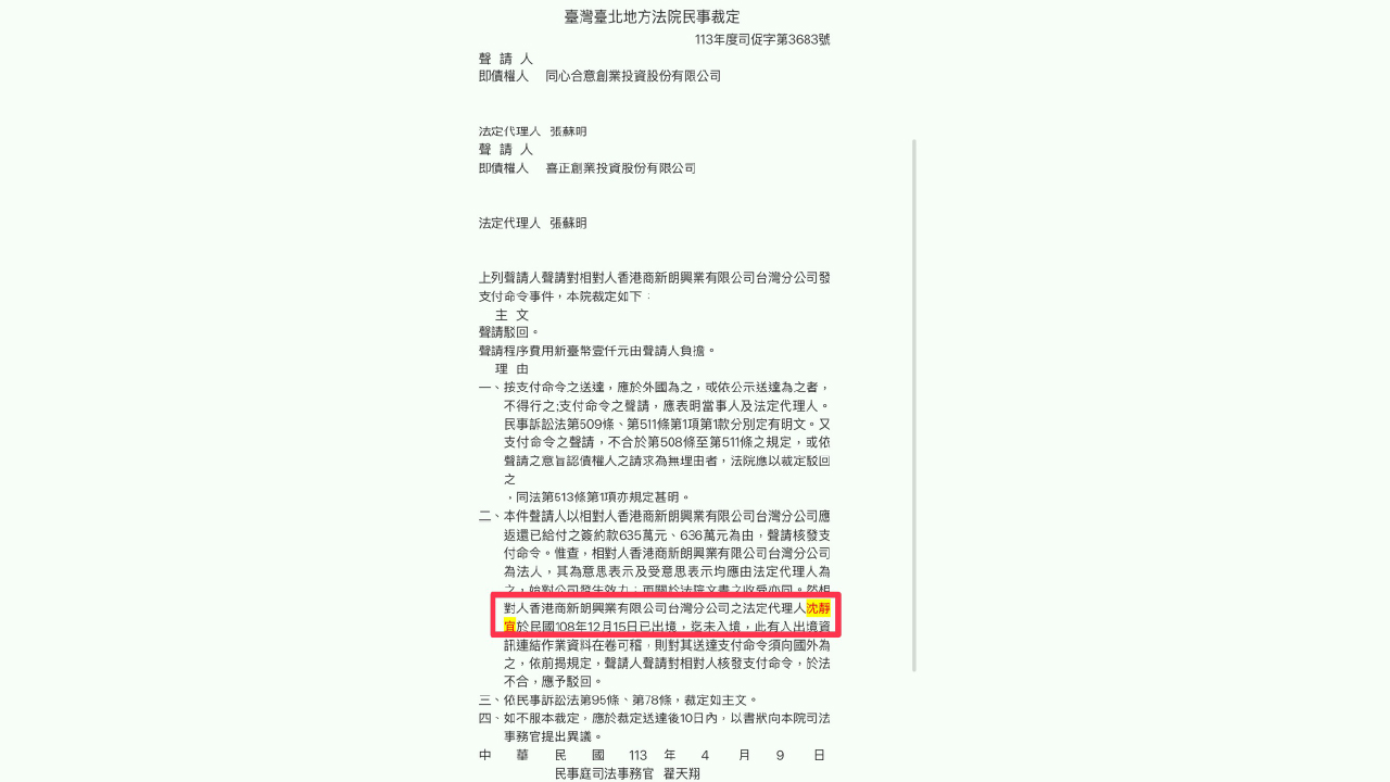 ↑圖說:新朗興業賤賣豪宅被控詐騙10億卻無法交屋,法定代理人沈靜宜挨告,法院調查沈和鍾姓財務主管都行蹤不明。(圖片來源:翻攝自司法院網站)