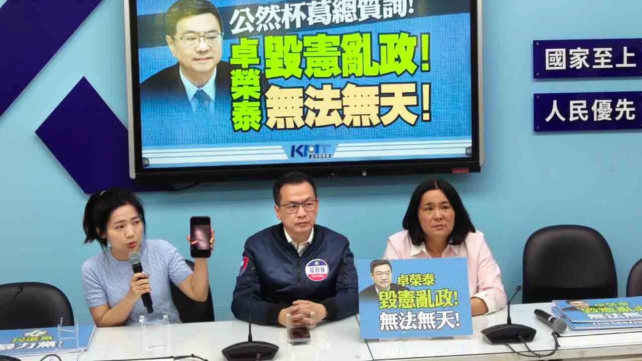 立法院近日因「反廢死」、「反戒嚴」兩項公投案引發朝野激烈衝突。國民黨立院黨團今(26)日召開記者會,針對民進黨持續霸佔主席台、行政院長卓榮泰未經宣布離席、以及綠營總召柯建銘疑似持拐杖攻擊立委徐巧芯等爭議,提出三大嚴正譴責,痛批民進黨「無法無天,暴力治國」。