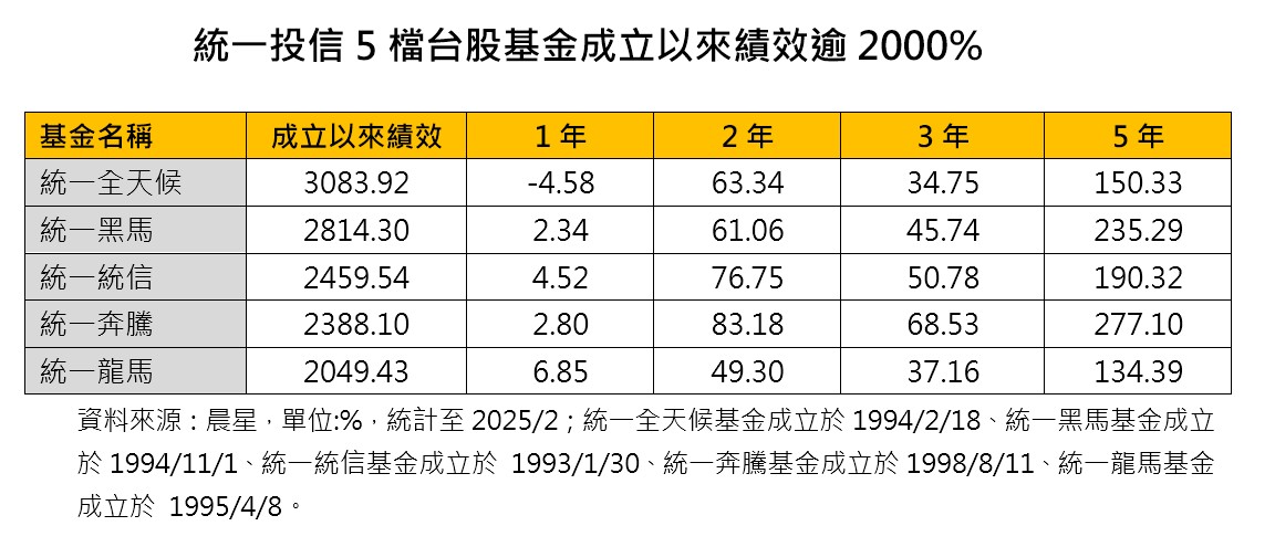 統一投信素來以股票型基金操盤團隊聞名,旗下的台股基金長期績效十分亮眼,據晨星統計至2月底,包括統一奔騰、統一黑馬、統一全天候、統一統信、統一龍馬等五檔基金,成立以來,都為投資人創造超過2000%的累積報酬率。