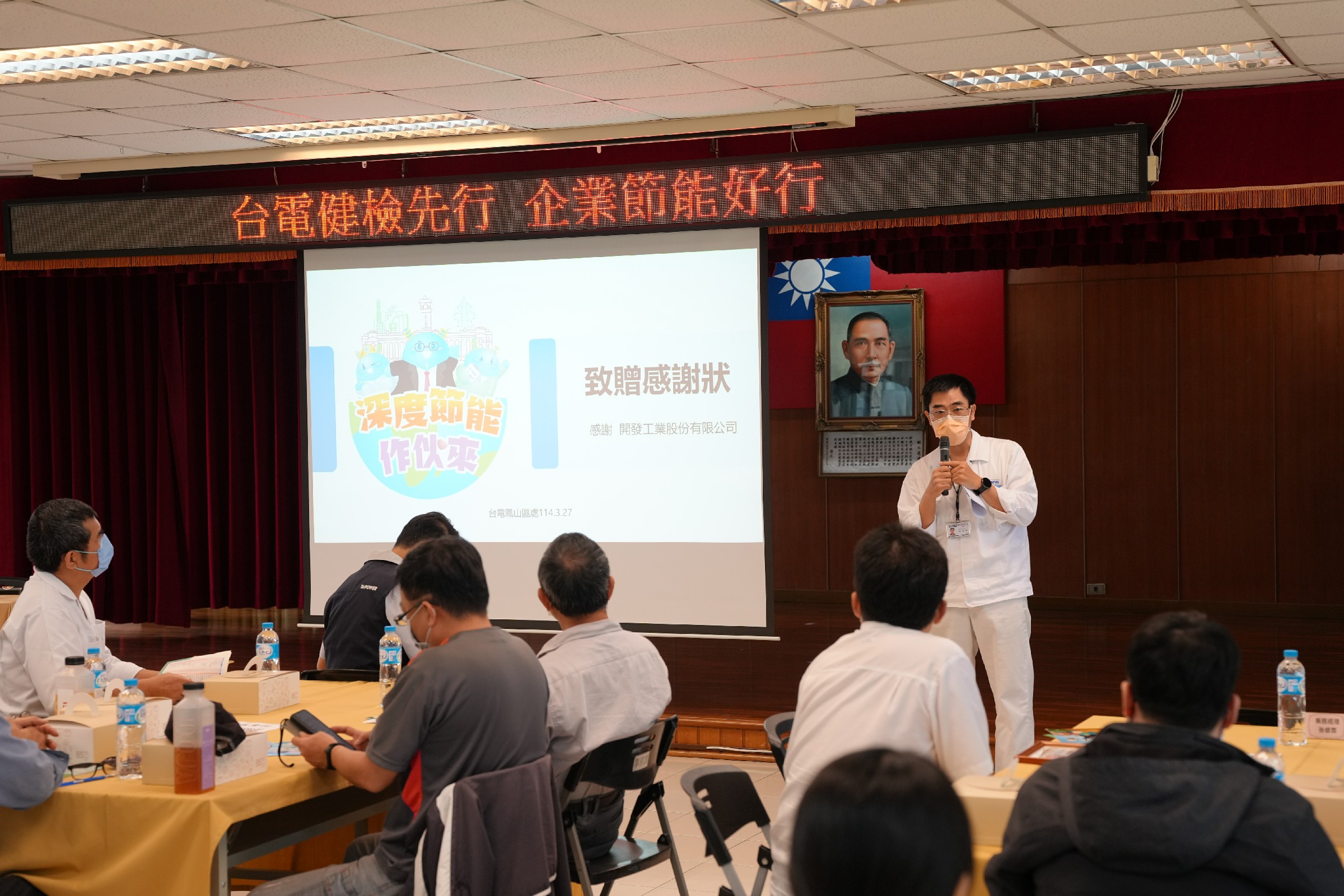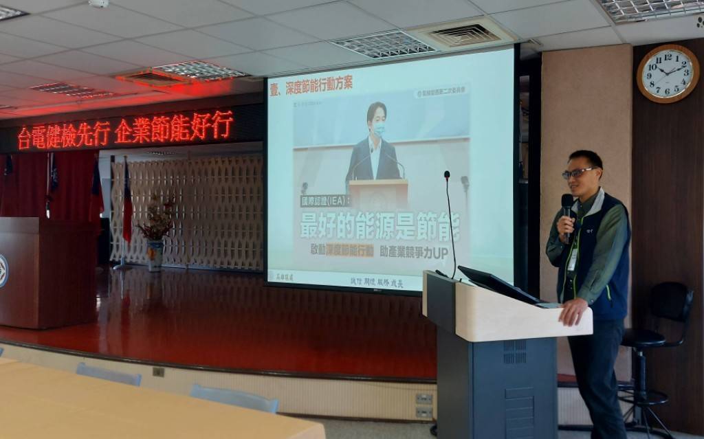 ↑圖說:台電鳳山區處邀請開發工業林經理上台針對移轉尖峰用電進行經驗分享。(圖片來源:台電高雄區處提供)