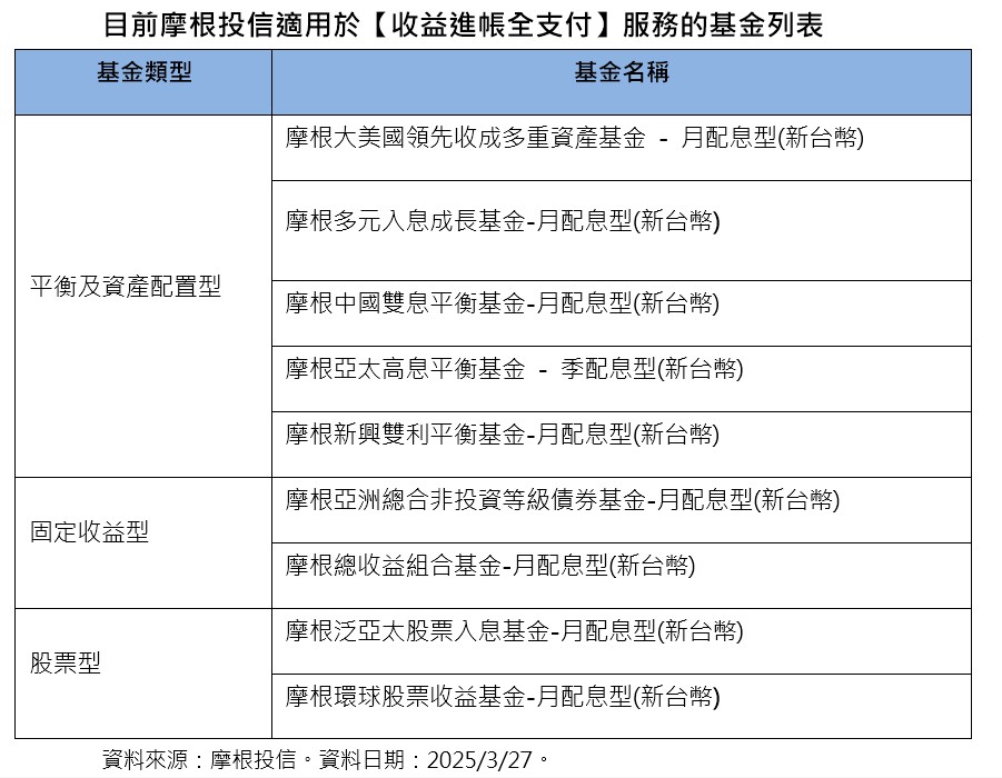 值得留意的是,目前適用這項服務的,只有9檔境內基金(如上表),未來待法令進一步開放後,會再評估擴大到境外基金;其次,單筆申購基金門檻為台幣10萬元;最後,投資人要把配息帳號,設定為全支付。