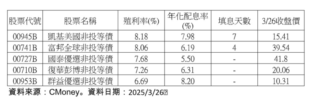 檢視5檔非投資等級債券ETF,除了每年1、4、7、10月季配的國泰優選非投等債,其餘4檔都已陸續在3月6日至3月19日除息,其中,富邦全球非投等債(00741B)用了4天填息,凱基美國非投等債(00945B)第7天填息,且年化配息率逼近8%。