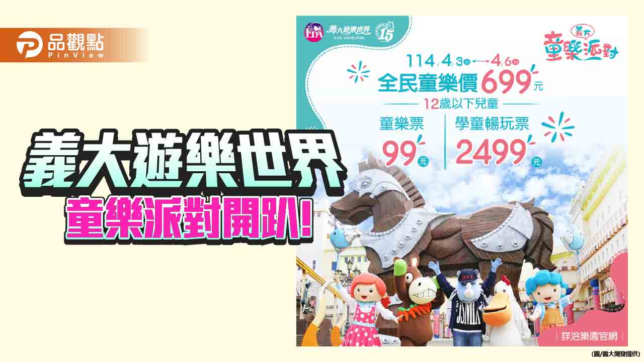 義大遊樂世界即將掀起歡樂熱潮!「童樂派對」於4月3日(四)至4月7日(日)盛大登場,為12歲以下孩童獻上專屬優惠,暢玩樂園僅需99元,大人票價也僅699元,全家出遊超值划算!連假期間還有多重驚喜,搭乘指定設施即可獲得懷舊玩具,讓小朋友玩得盡興、滿載而歸。4月5日(六)更邀請超人氣的香蕉哥哥和櫻桃姊姊現身YOYO見面會,帶來活力滿滿的歌舞互動,一同唱唱跳跳、嗨翻全場!