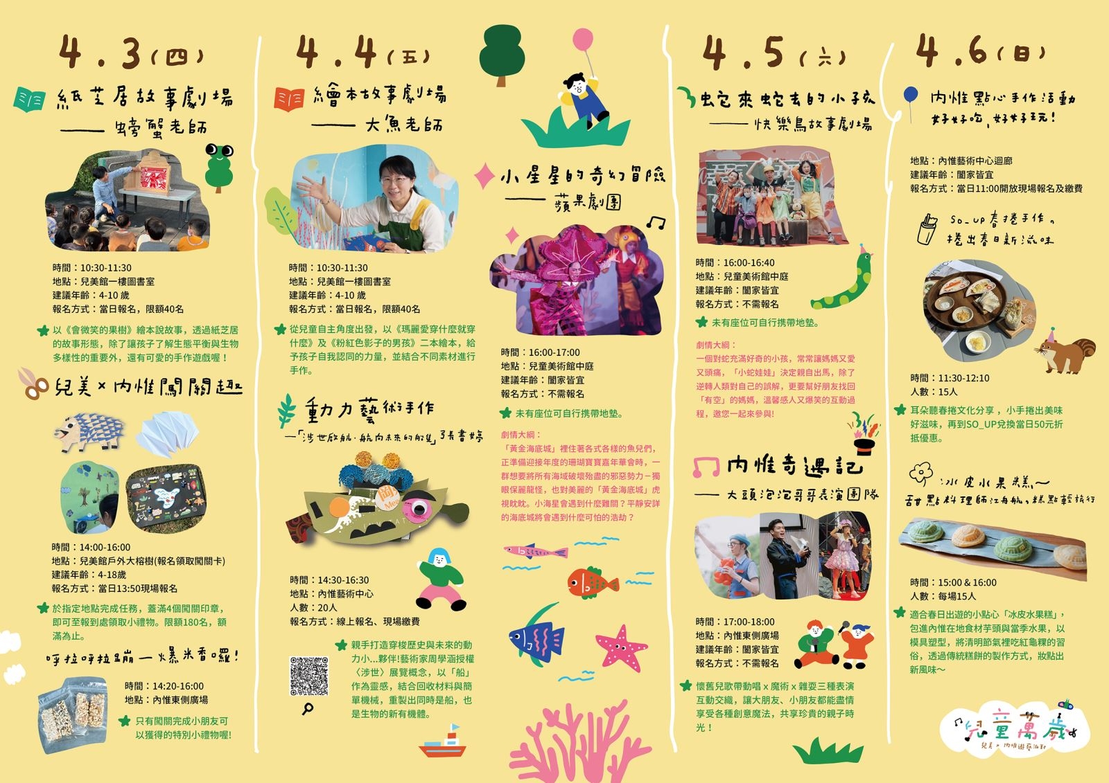 4月4日的兒童節當天,大魚老師的繪本故事劇場將帶來《瑪麗愛穿什麼就穿什麼》與《粉紅色影子的男孩》兩本繪本,透過故事劇場與創意手作課程,讓孩子們探索自我認同與多元包容的價值。內惟藝術中心則安排「涉世啟航,航向未來的船隻」手作課,邀請親子利用回收材料和簡單機械,創作出穿越時空的動力藝術作品。下午,蘋果劇團於兒美館中庭獻上《小星星的奇幻冒險》,講述魚兒們在「黃金海底城」與獨眼保麗龍怪對抗的驚險故事,歡迎全家自備地墊,共享冒險劇場的歡樂時光。