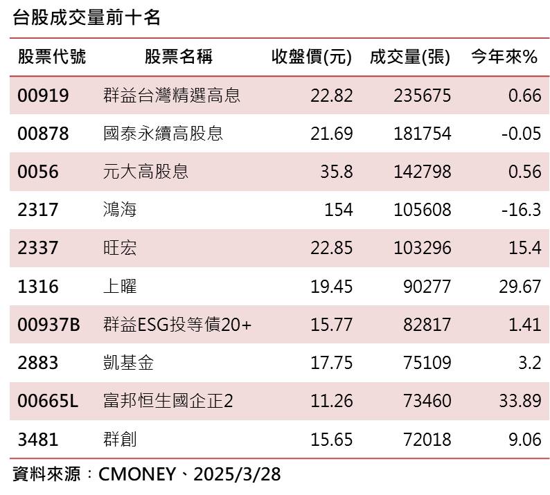 觀察今日上市櫃2162檔股票成交量前十名,共有5檔是ETF,其中前三大分別為(00919)群益台灣精選高息、(00878)國泰永續高股息、(0056)元大高股息,都是台股高息ETF。