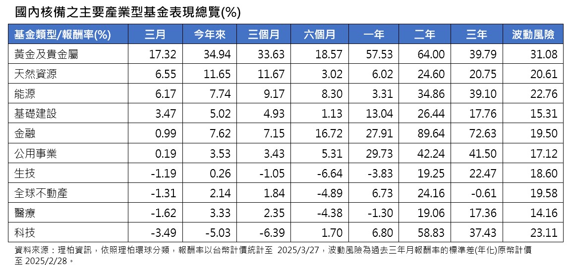 進一步來看,在產業型基金部分,黃金及貴金屬基金表現最猛,單月平均上漲17.3%,連續3個月居冠;其次是天然資源基金、能源基金,平均漲幅都超過6%;基礎建設基金也有3.4%的表現。