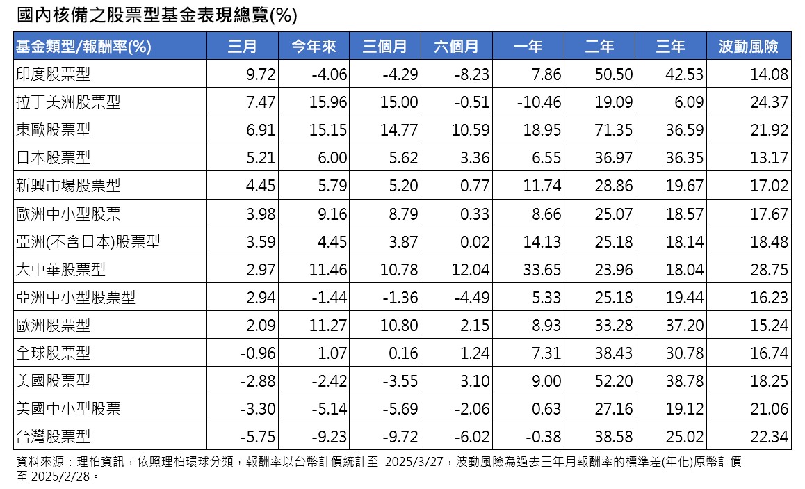 區域股票型基金部分,印度基金強力反彈,3月平均報酬率9.7%,一吐2月下跌4.8%、連續2個月墊底的怨氣;其次,拉美基金上漲7.4%,表現也很亮眼。