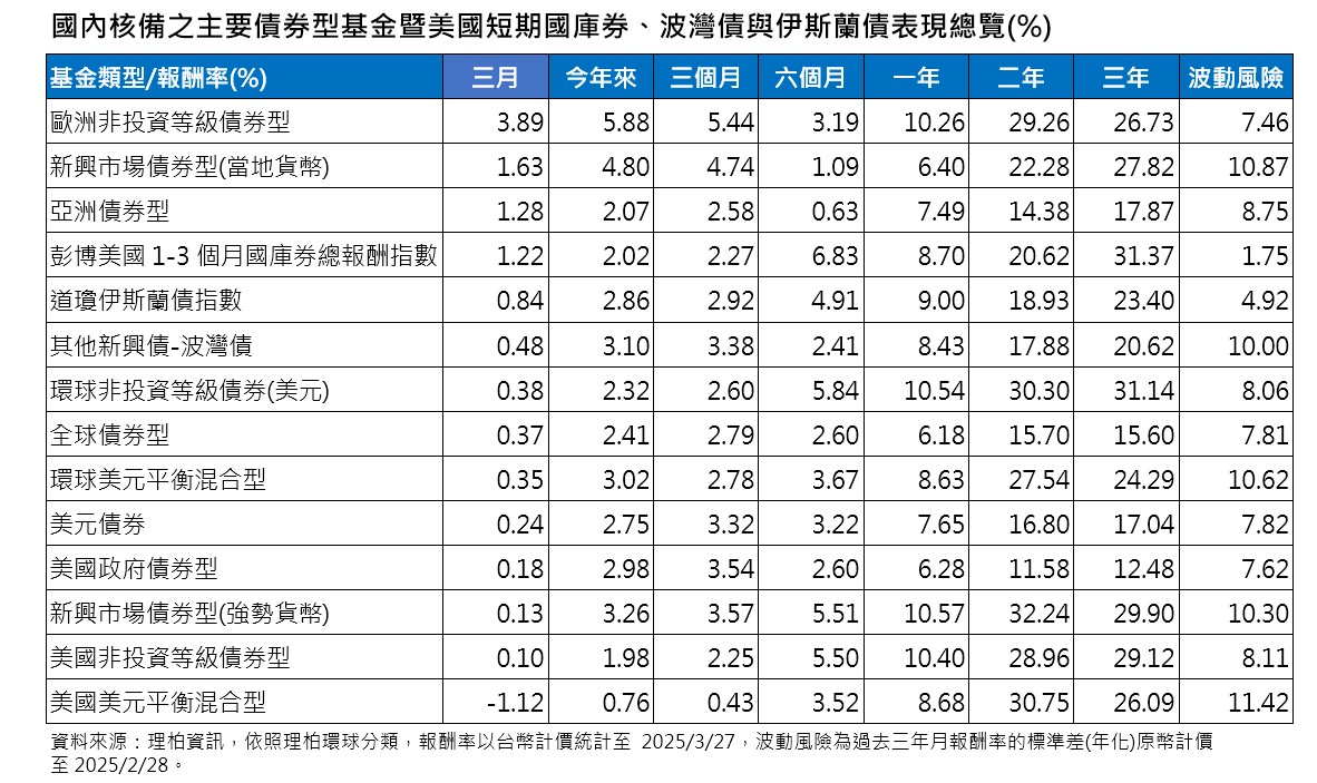 主要債券及平衡型基金部分,俄烏戰局有望持續朝停火方向前進,帶動歐元走強,美元回落,也為非美國市場帶來投資契機,歐洲非投資等級債基金3月以來上漲3.89%,新興市場當地貨幣債券基金上漲1.63%。