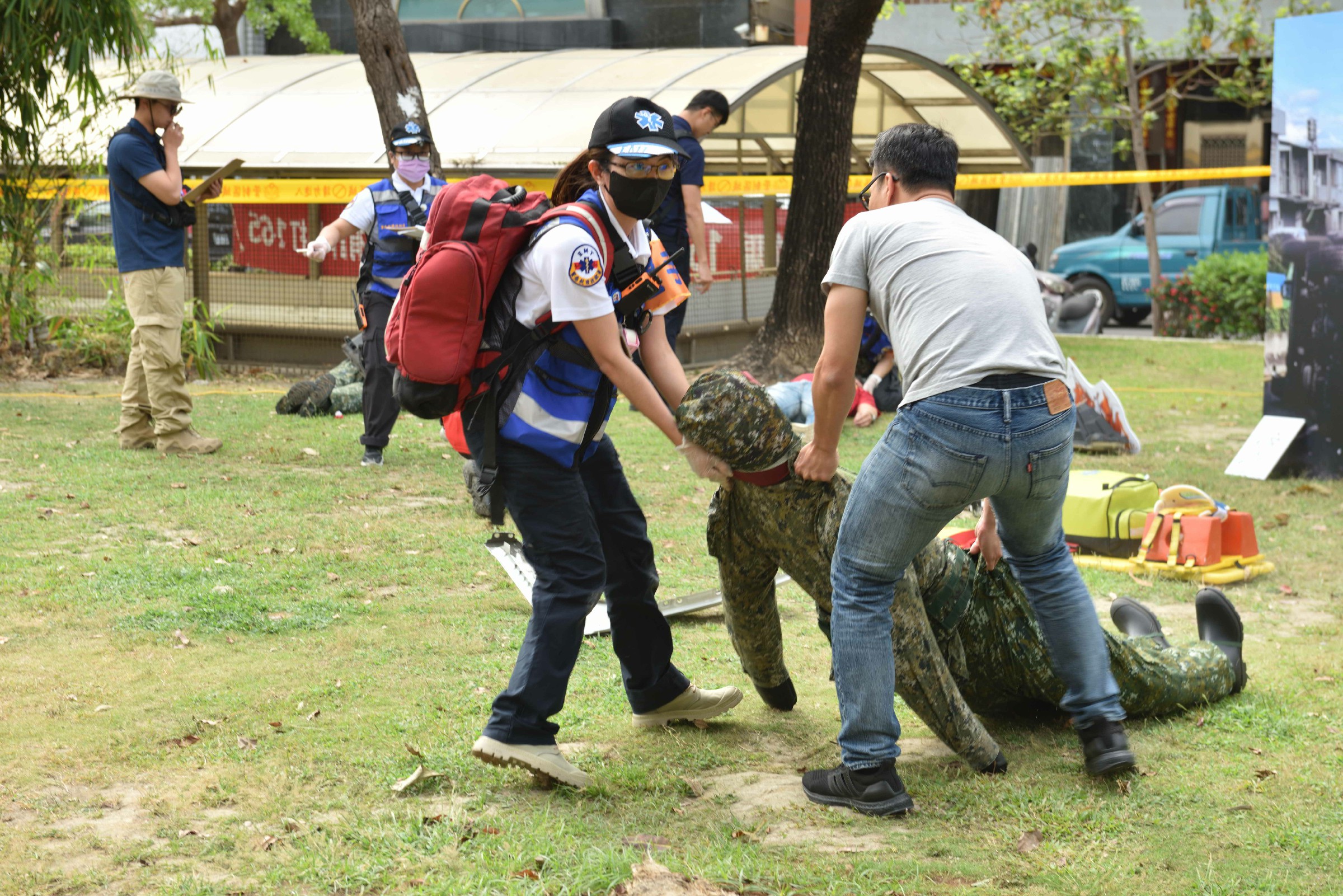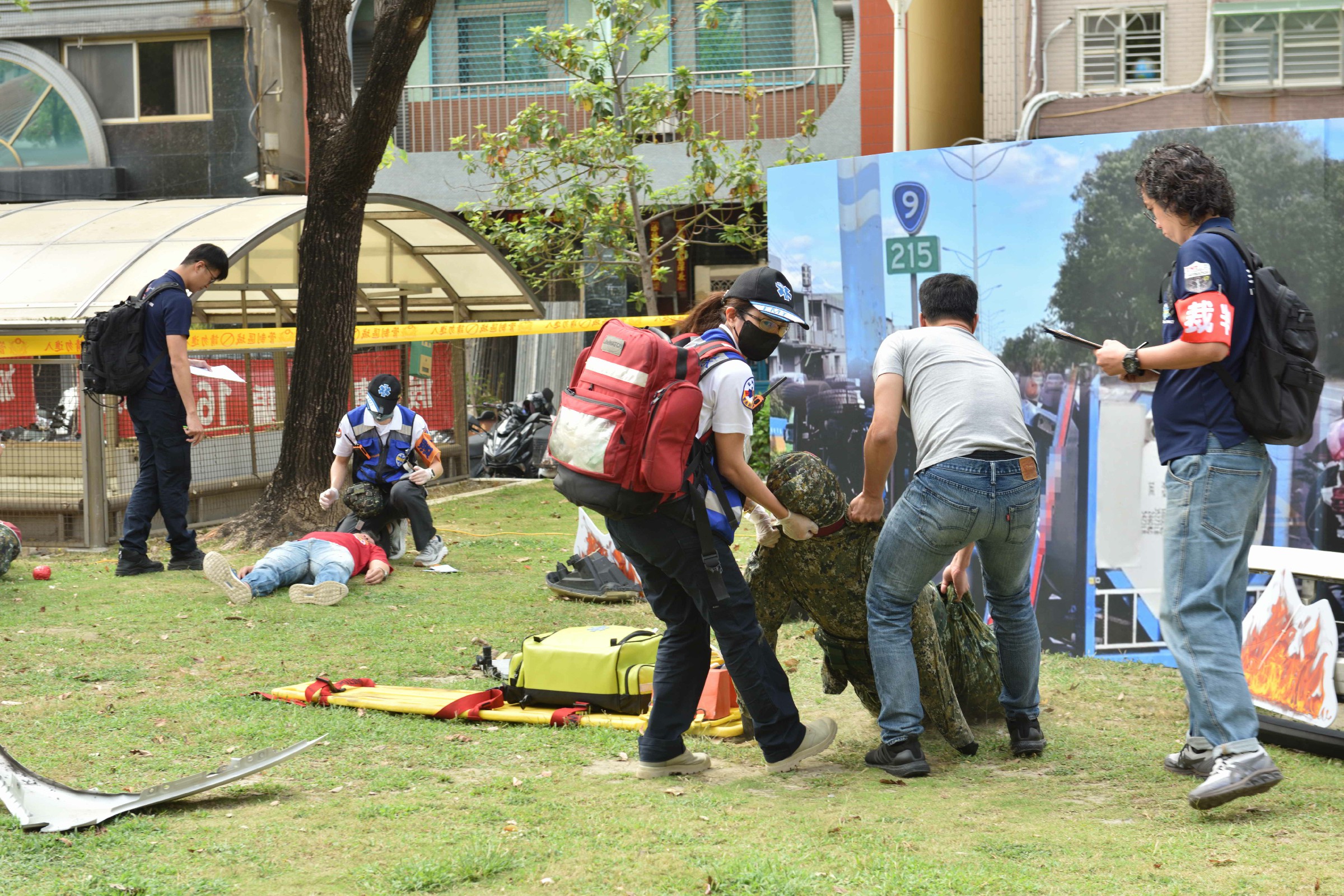 ↑圖說:模擬化學槽車翻覆造成連環車禍,由救護義消進行檢傷後,將傷患搬運到安全處(圖片來源:高雄市義消總隊提供)