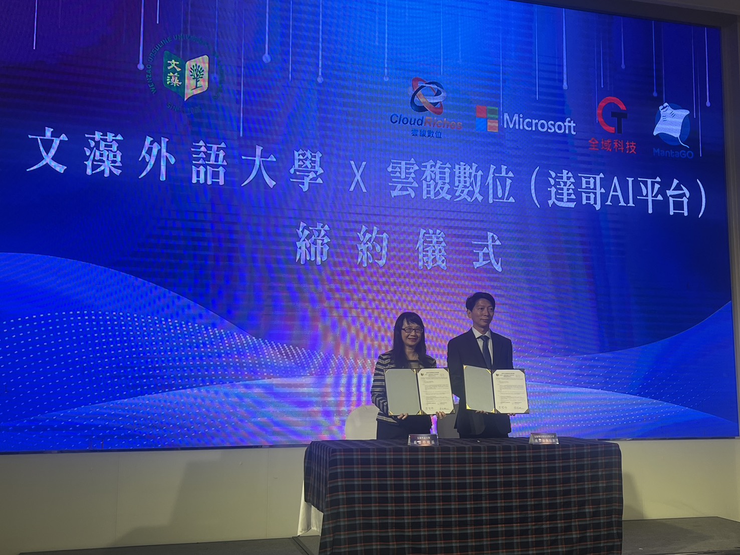 此次簽約儀式由文藻外語大學校長莊慧玲與雲馥數位執行長桂梓捷代表出席簽約。莊慧玲在致詞時表示,為因應AI 浪潮,文藻自2024年9月起,將AI發展納入未來三年的校務發展重點,並陸續開設生成式AI課程與認證檢定,培育各系AI種子教師。此外,學校成立校級「AI創新發展中心」,主要目標為提升教職員生的AI與科技技能、強化自主探索能力的素養學習、推動人文與科技的雙向賦能。結合校內相關單位,共同研發創新教學法與教材,使AI技術有效融入教學環境,進一步提升教學品質與學習成效。此次文藻透過AI技術,從事教育創新,幫助學生提升學習效率,培育師生與時俱進的AI科技應用能力。