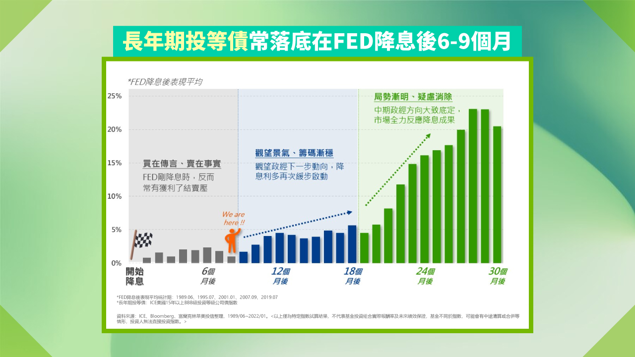 富蘭克林華美投信FT投資級債20+ ETF(00982B)基金經理人洪慧珊表示,統計1989~2022年歷史數據,降息環境中,15年期以上BBB級債券指數,常常落底在美國聯準會降息後6至9個月。