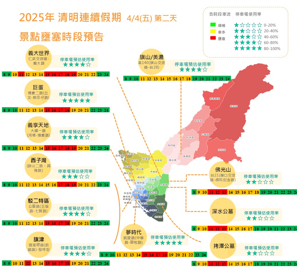 ↑圖說:4/4(五)清明連續假期第二天景點交通壅塞時段預告。(圖片來源:高雄市交通局提供)