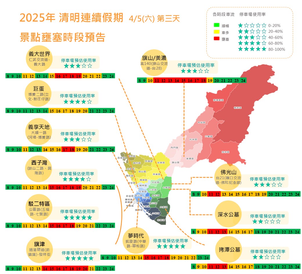 ↑圖說:4/5(六)清明連續假期第三天景點交通壅塞時段預告。(圖片來源:高雄市交通局提供)