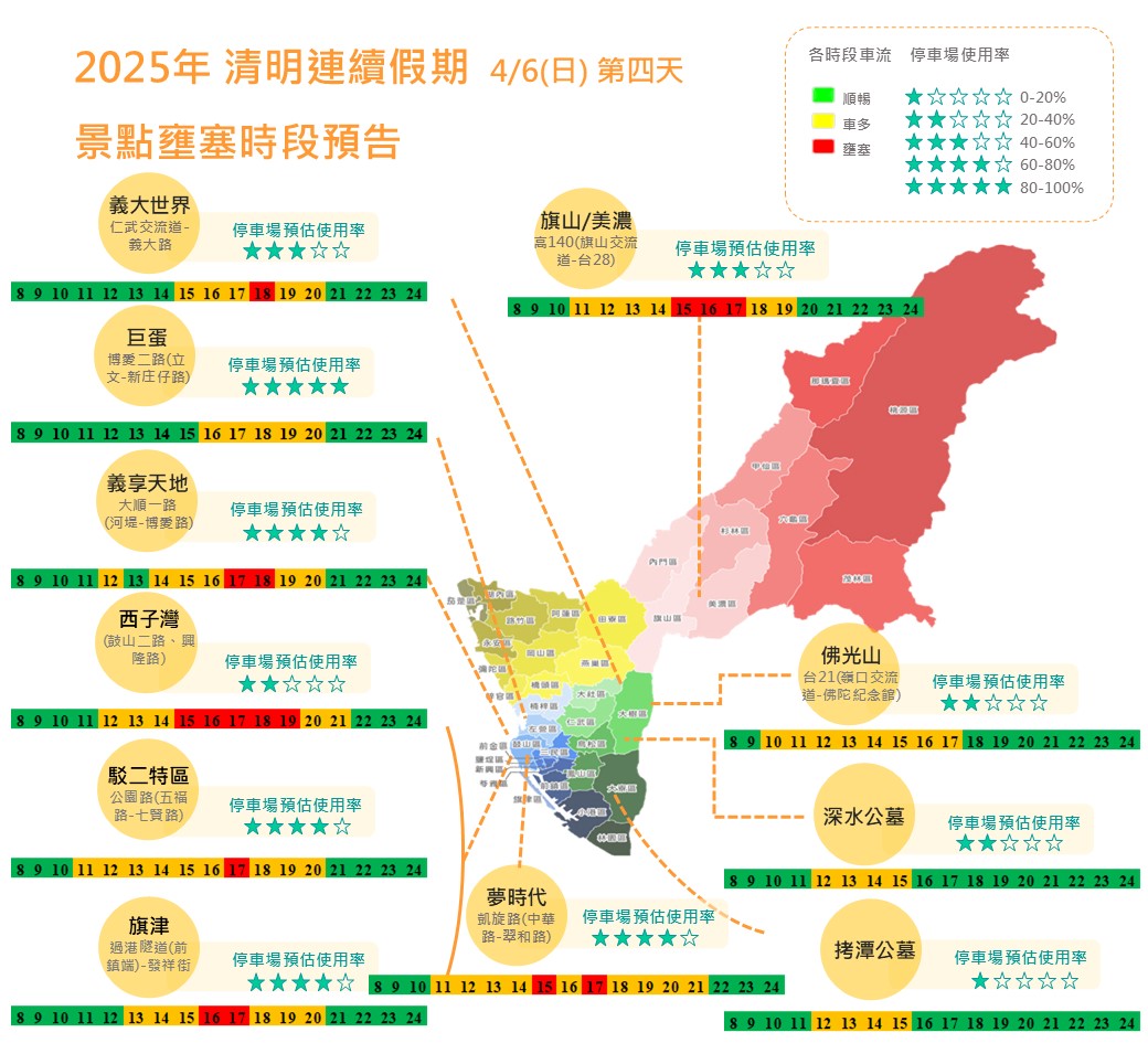↑圖說:4/6(日)清明連續假期第四天景點交通壅塞時段預告。(圖片來源:高雄市交通局提供)