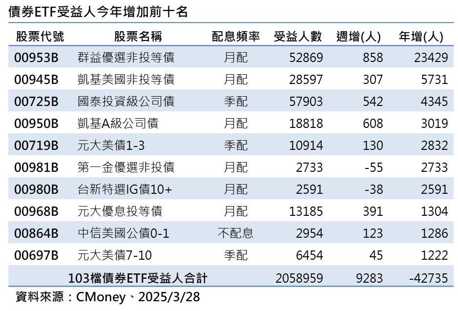 截至3月28日最新統計顯示,103檔債券受益人減少4萬2735人,總人數降到205萬8959人,觀察今年來受益人逆勢增加最多的前十檔,其中,00953B群益優選非投等債增加2萬3429人奪下最具人氣王。