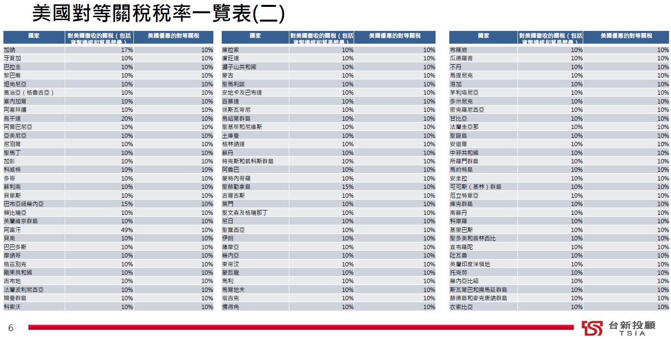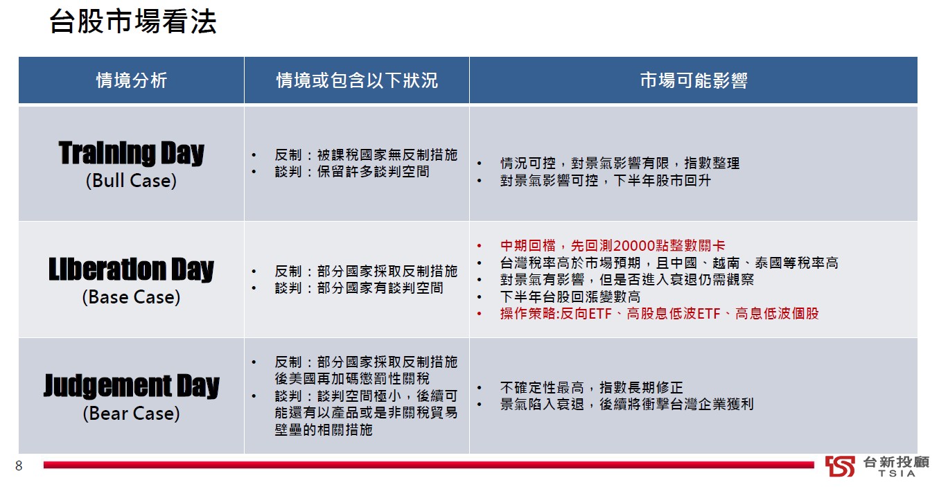 台新投顧也快速發布完整精彩分析報告,沙盤推演台股可能有三種情境,最好的情況,是被課稅國家沒有反制,保留談判空間,如此一來,情況可控,對景氣影響有限,指數整理,下半年股市回升。