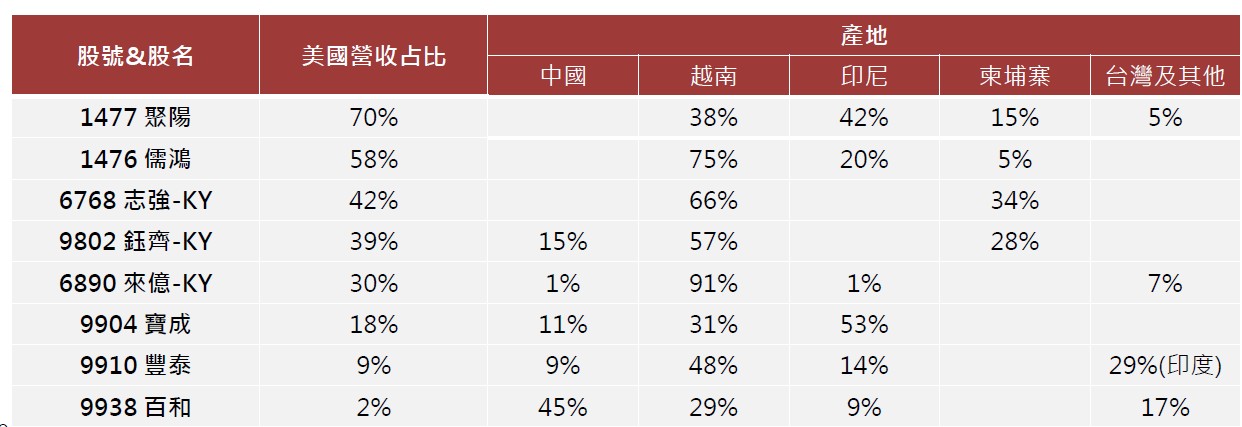 成衣製鞋部分,台新投顧指出,幾乎所有產地均被美國課徵重稅,預期必須跟客戶共同承擔。