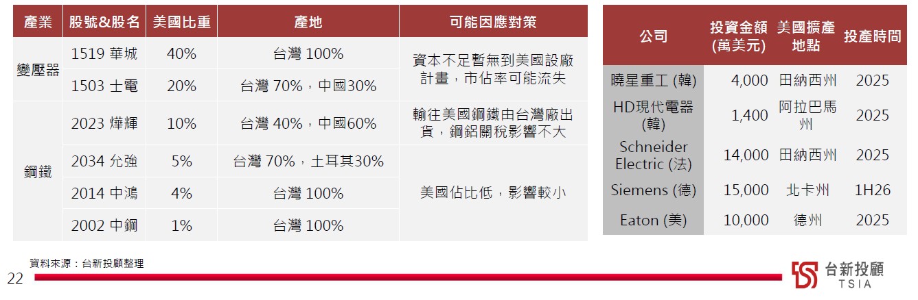 重電產業部分,台新投顧分析,主要客戶為台電,產能主要在台灣,由於資本不足,華城、士電等業者目前無到美國設廠計畫,然而包含韓國、法國、德國等重電設備同業近年均前往美國設廠,預計2025年陸續開出產能,本次出口美國遭課32%對等關稅,預計將顯著影響台廠變壓器輸美動能。